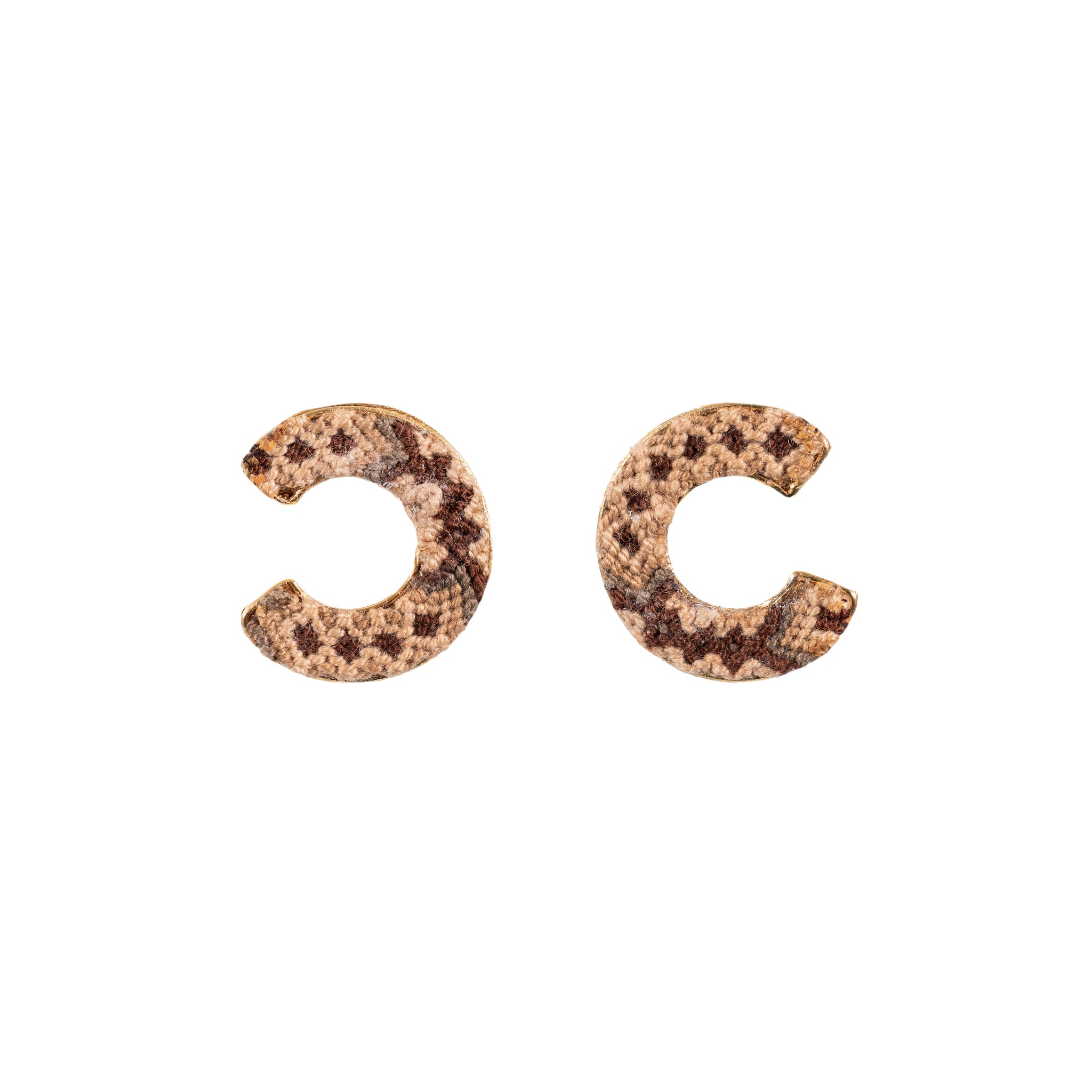 Candongas elaboradas con base y textil tejido a mano por artesanos Wayuu en la península de La Guajira en el norte de Colombia. Cada pieza es única, su tejido étnico preserva la cultura y el trabajo artesanal característico de esta comunidad indígena.