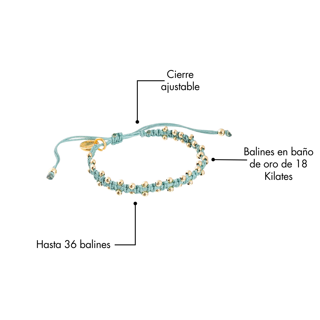 Pulsera tejida con balines metálicos en rodio color oro, una expresión de delicadeza y sofisticación. Sus nudos entrelazados capturan la esencia del arte y la exclusividad en cada detalle.