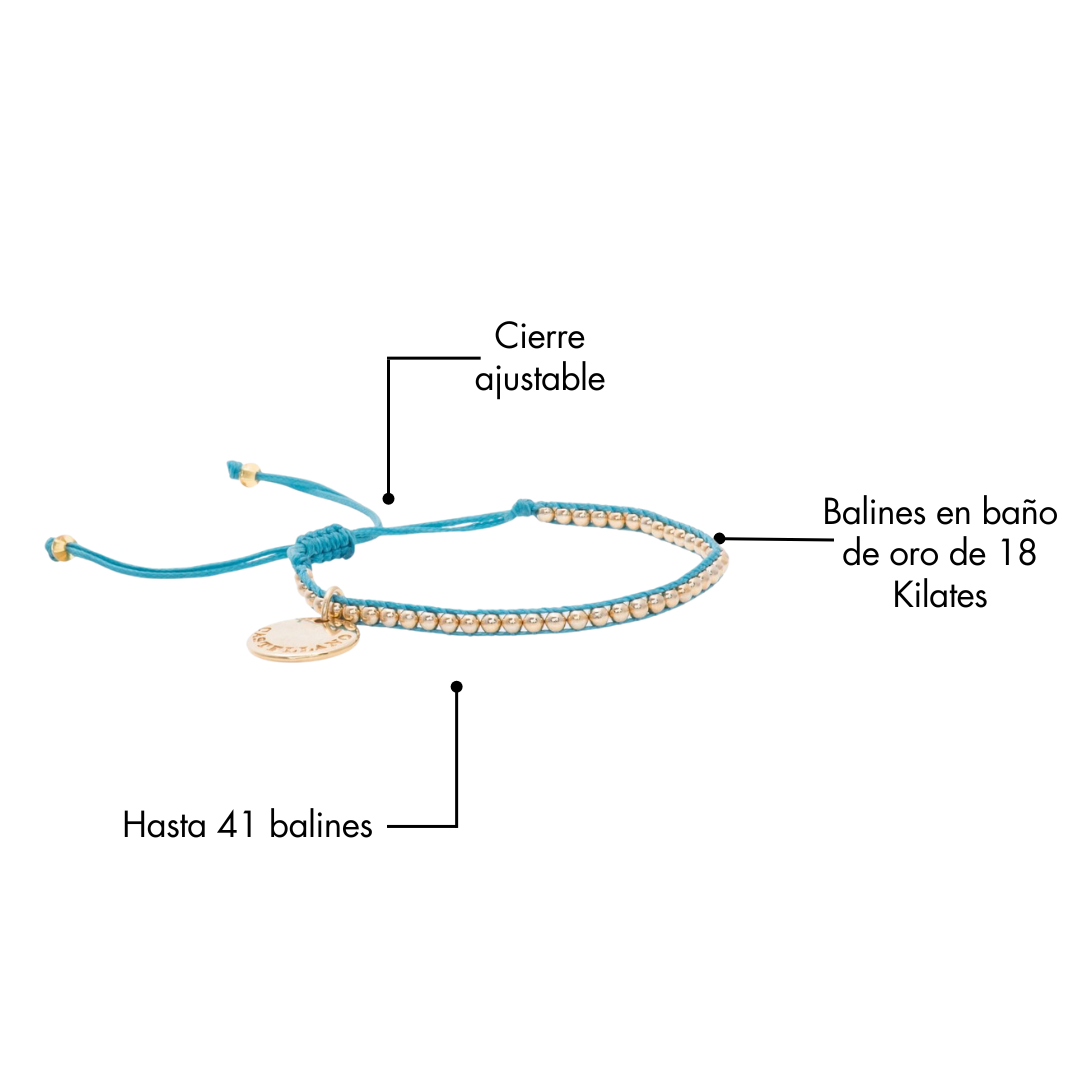 Nuestra pulsera está tejida con balines metálicos en rodio con baño en oro, que aporta un dorado intenso y una sofisticación única. Sus nudos entrelazados capturan la esencia del arte y la exclusividad en cada detalle.
