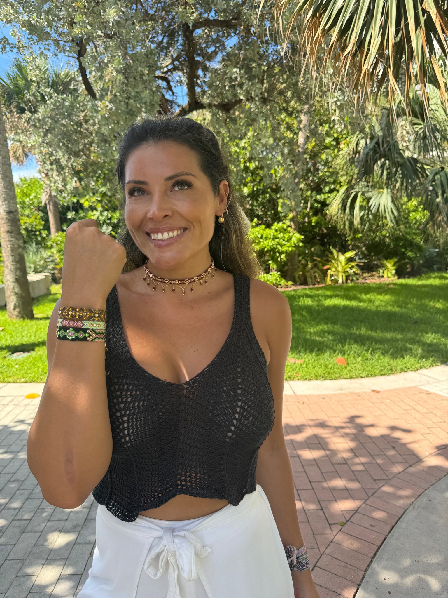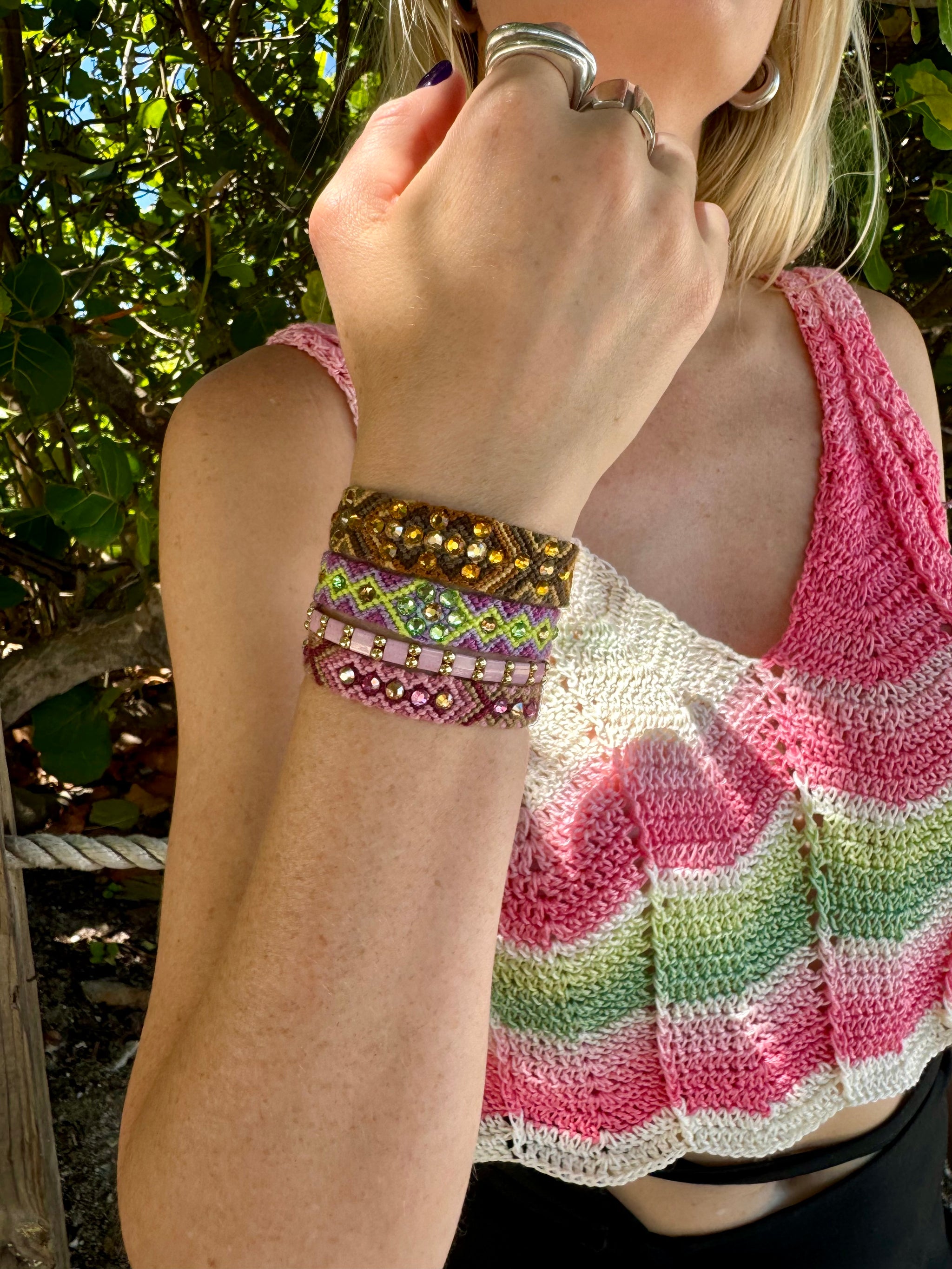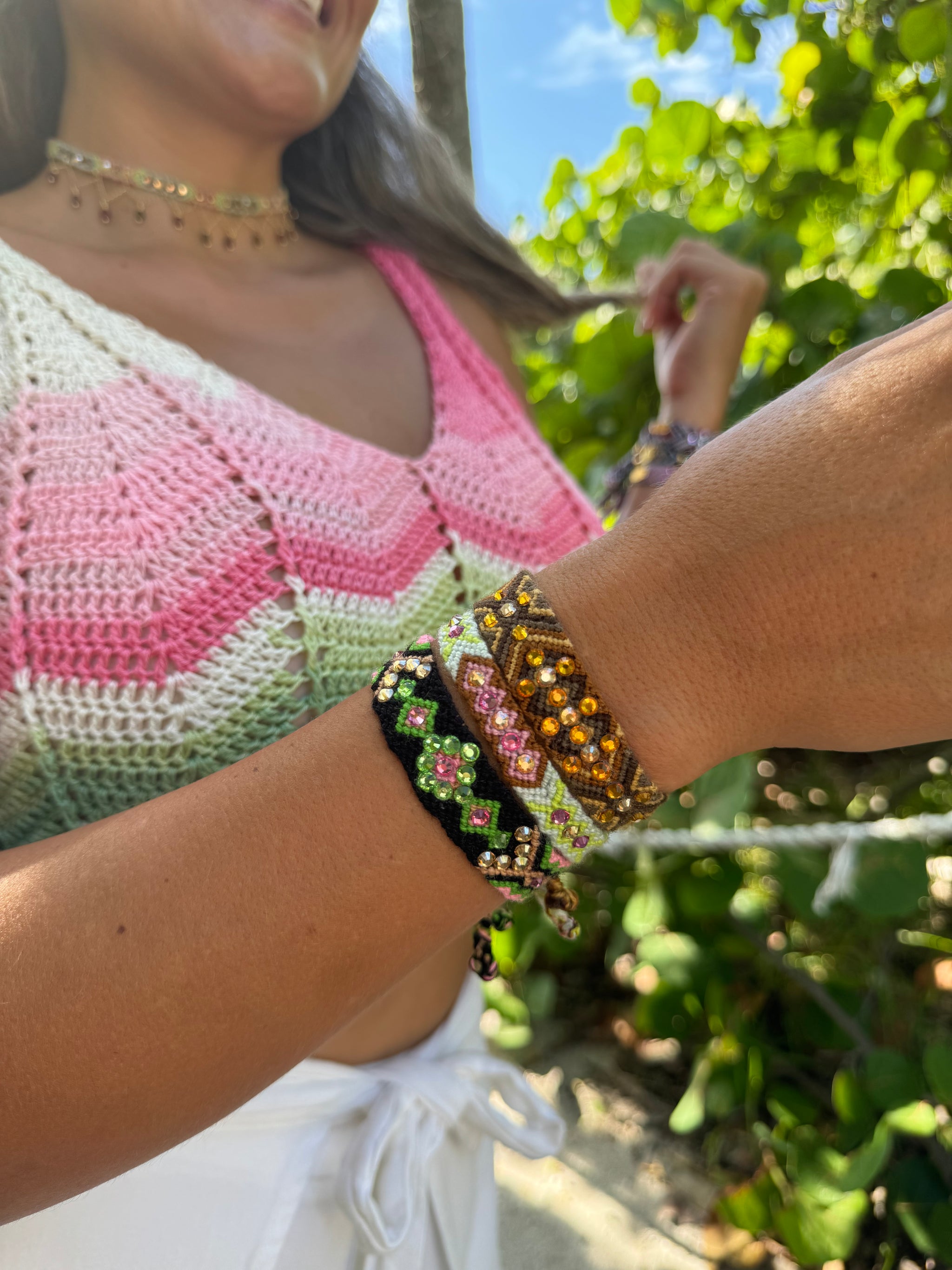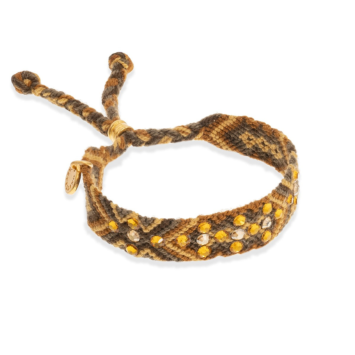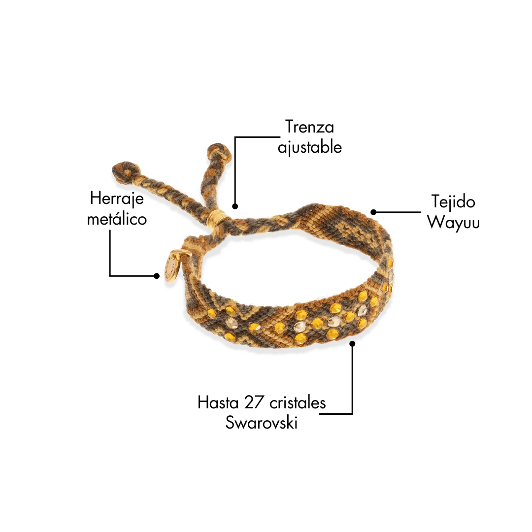 - Pulsera Wayuu con cristales de Swarovski y cierre ajustable color oro.