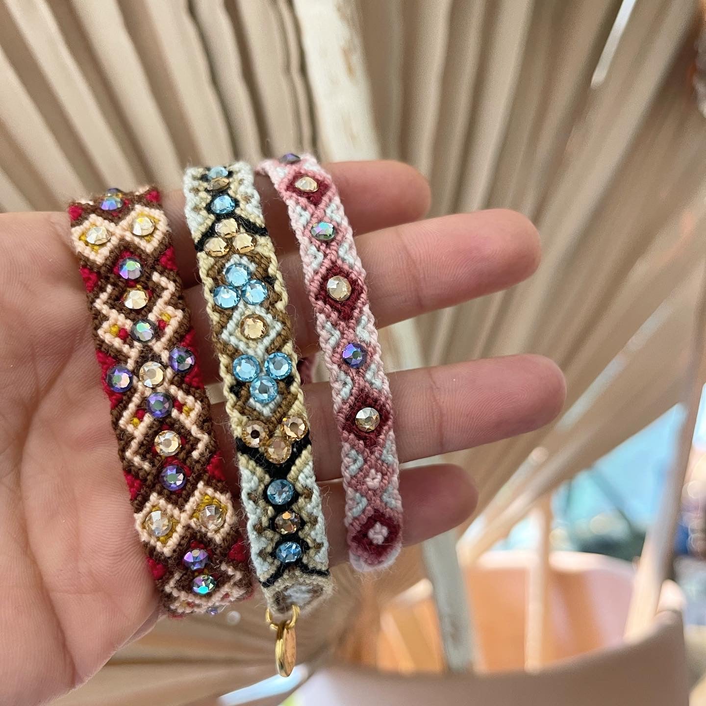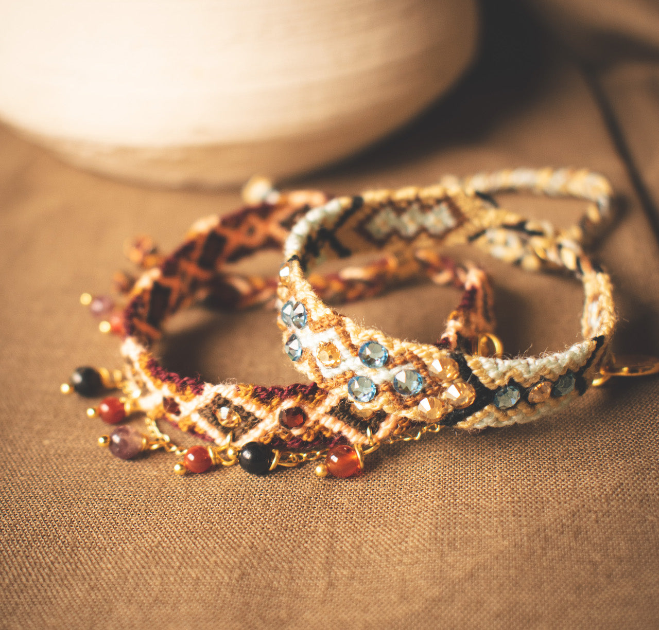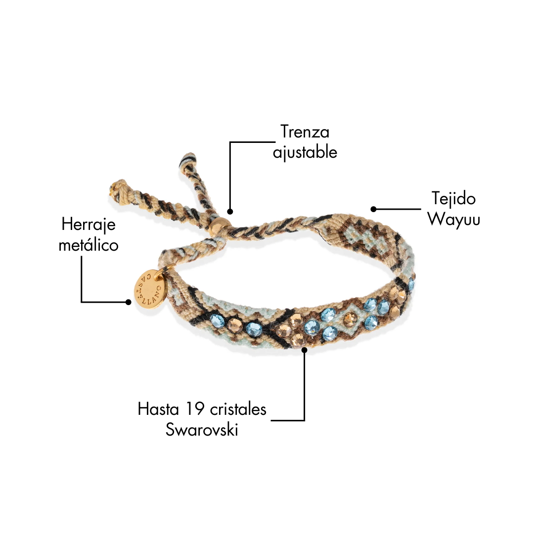 - Pulsera Wayuu tejida a mano con cristales Swarovski y cierre ajustable en tono dorado.