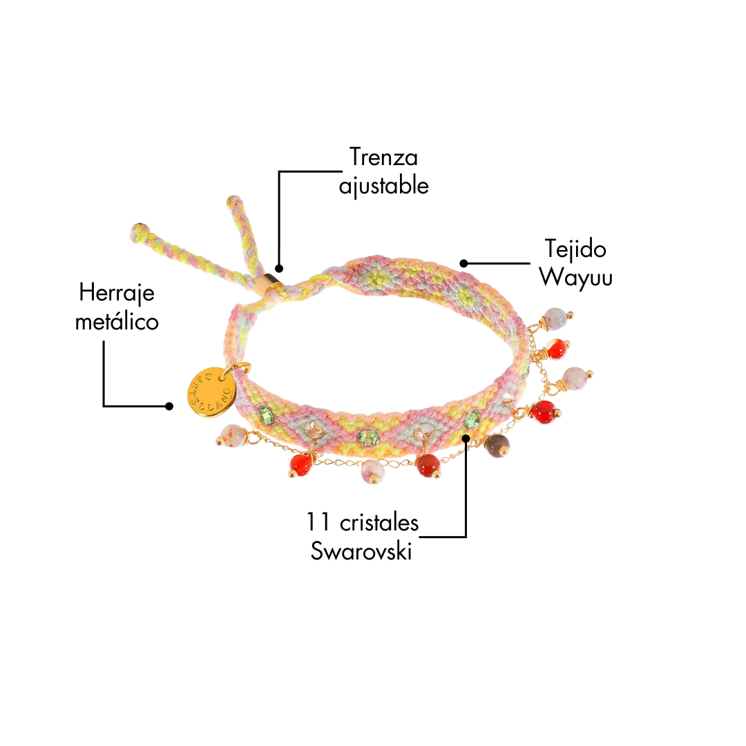 Pulsera Wayuu tejida a mano con cristales Swarovski y piedras naturales.
