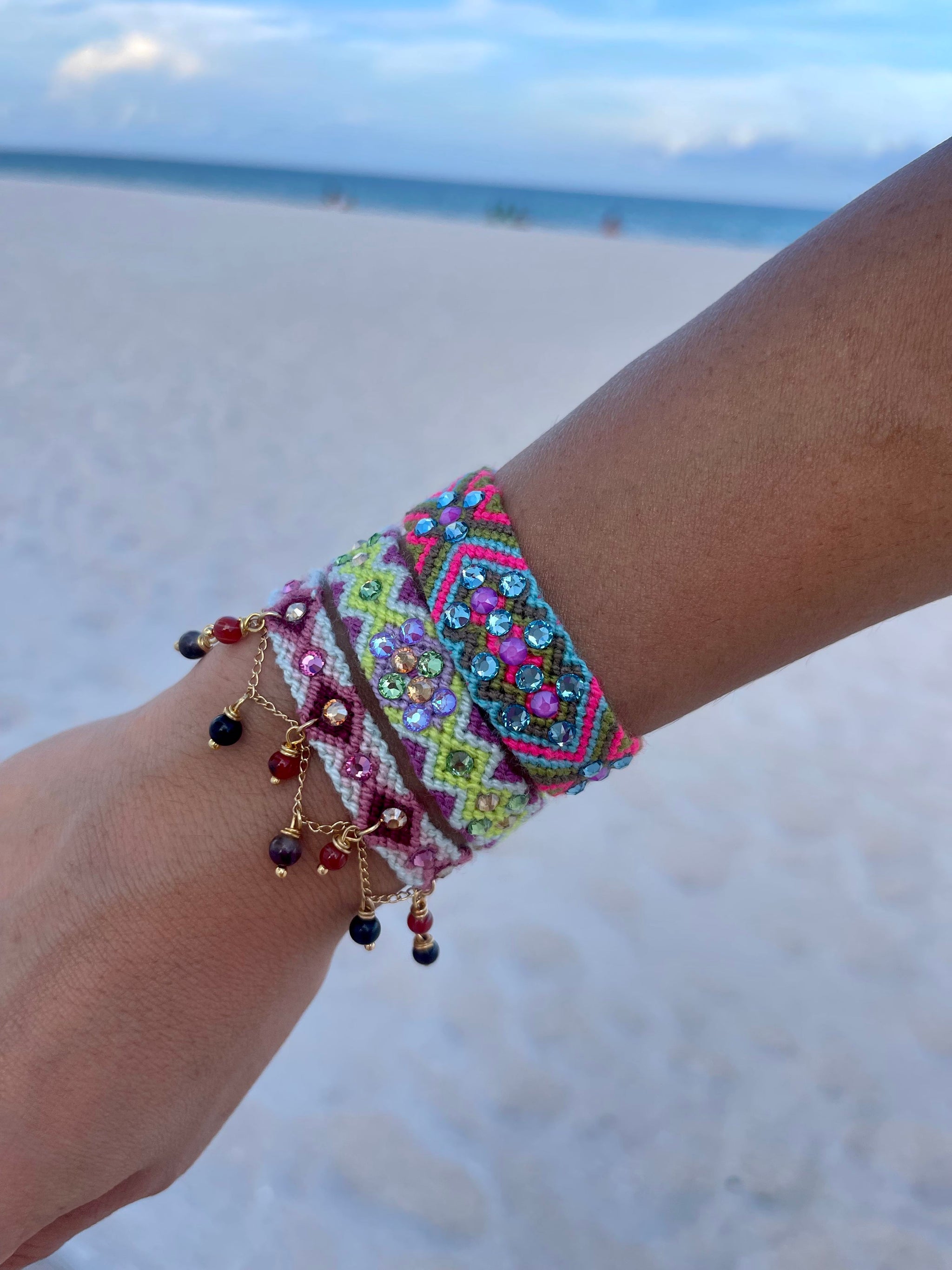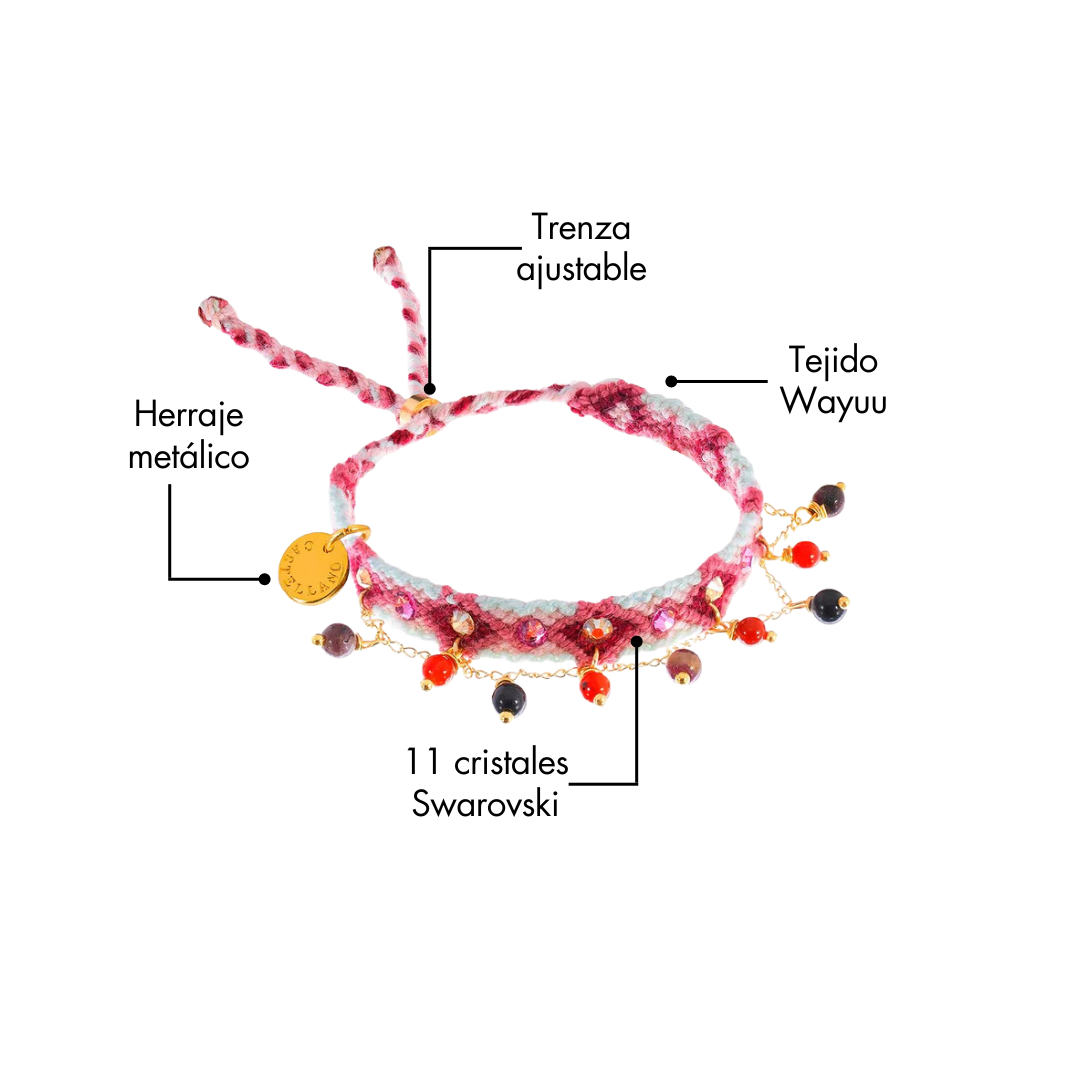 Pulsera Wayuu tejida a mano con cristales Swarovski y piedras naturales.
