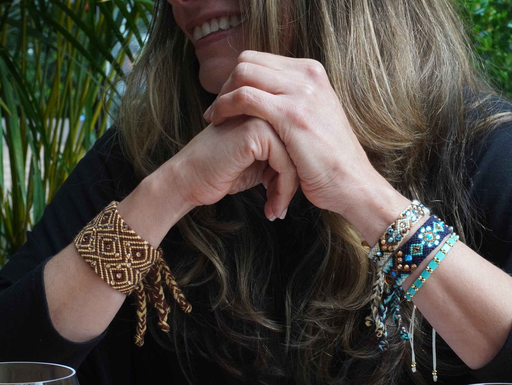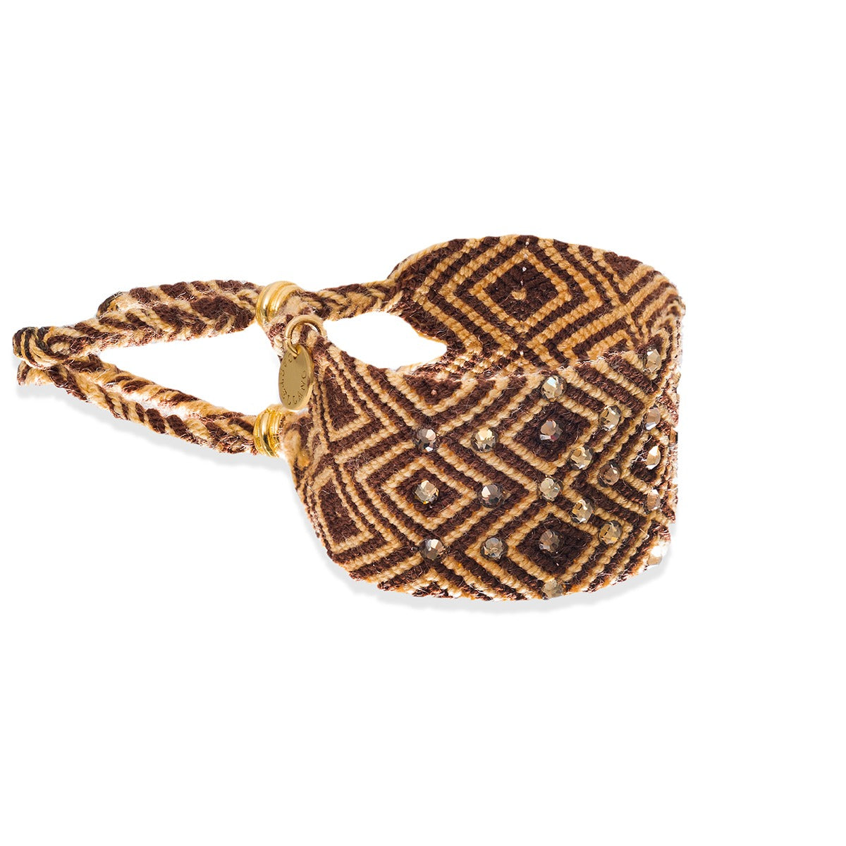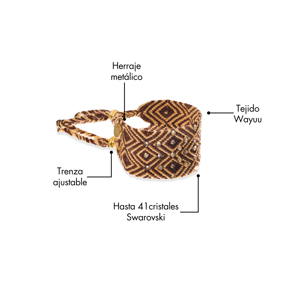 Nuestra pulsera doble, tejida a mano y con cristales Swarovski colocados a mano uno a uno sobre cada textil, combina la belleza de la moda con un mensaje inspirador que resalta el legado de mujeres que durante generaciones han tejido historias de resistencia y sabiduría en cada diseño.