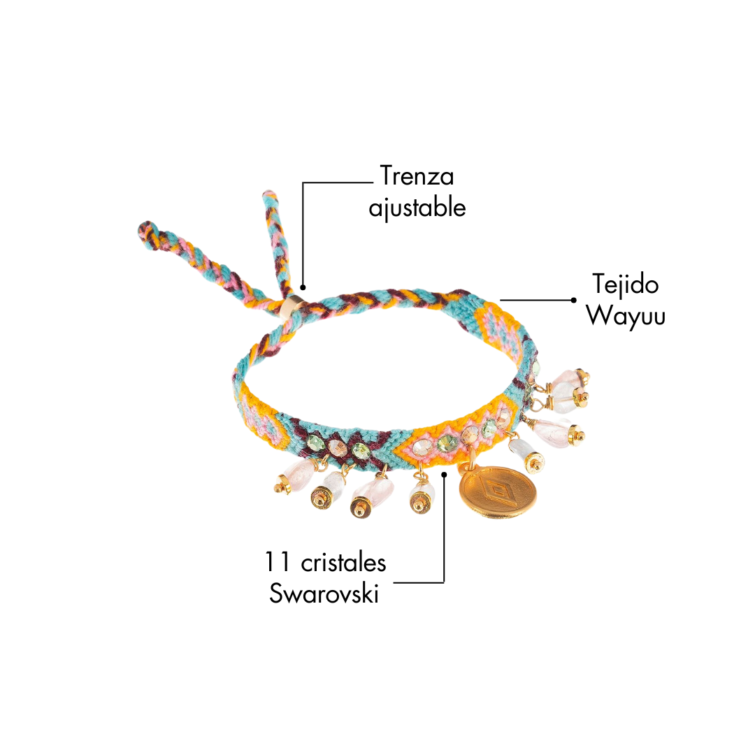 Pulsera Wayuu con cristales Swarovski, cuarzos Citrino, Amatista rosada, Lepidocrocita y pieza en bronce bañado en oro.