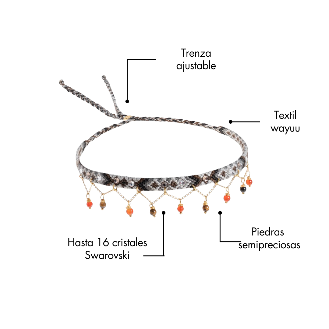 Nuestro choker, tejido a mano con cristales Swarovski y piedras semipreciosas como turmalina y ojo de tigre, es una joya con alma.