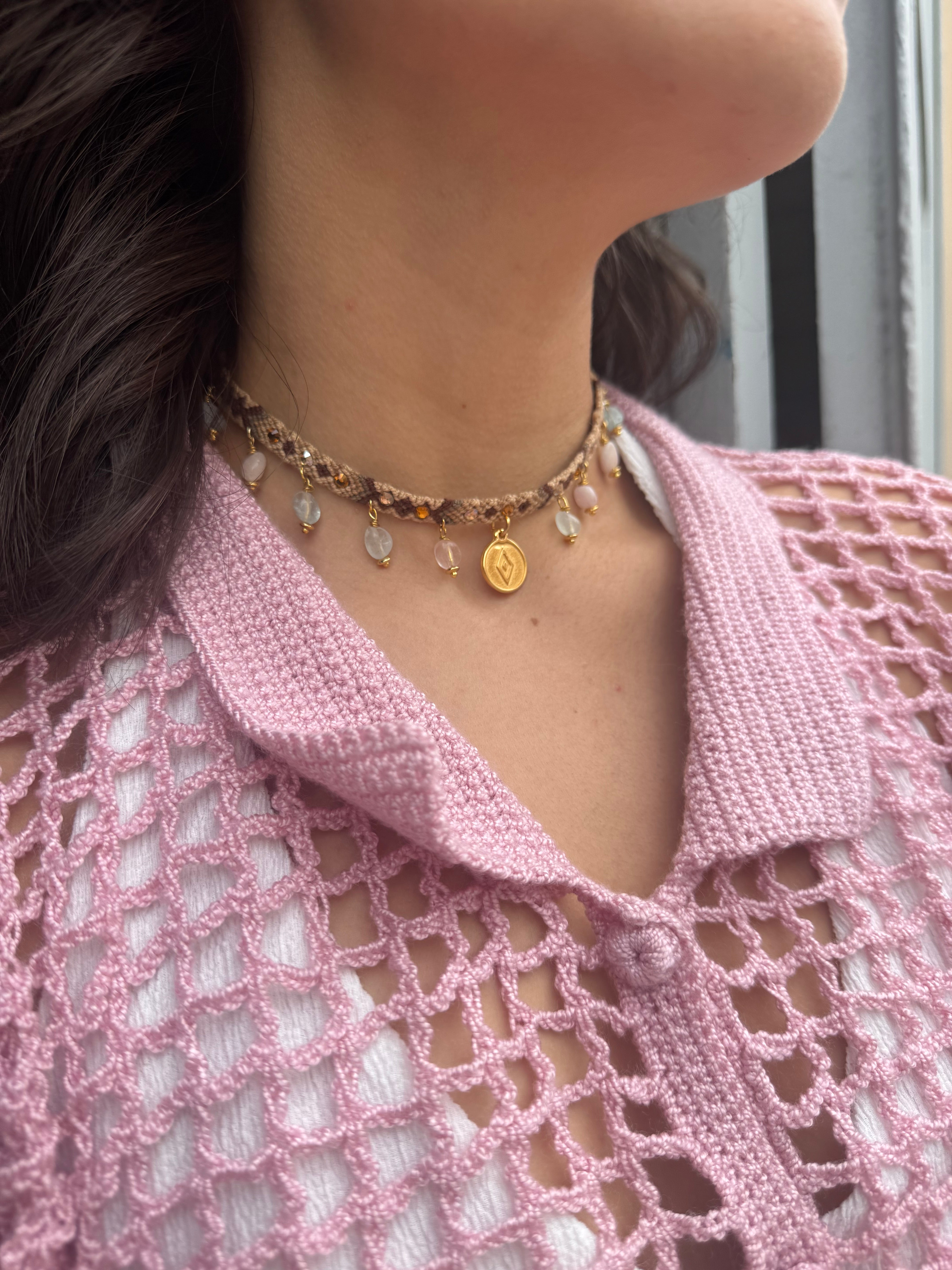 Tejido a mano por artesanos, con cristales swarovski que resaltan por su brillo y cuarzos como citrino, amatista rosado, lepidocrocita, que transmiten su energía y belleza natural; nuestro choker es un símbolo de tradición, belleza y preservación ancestral.
