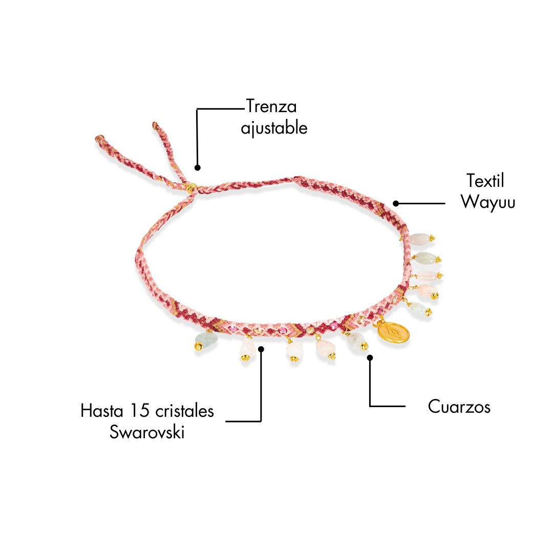 Nuestro choker, tejido a mano por artesanos, combina el brillo de cristales Swarovski con la energía de cuarzos como citrino, amatista rosado y lepidocrocita.