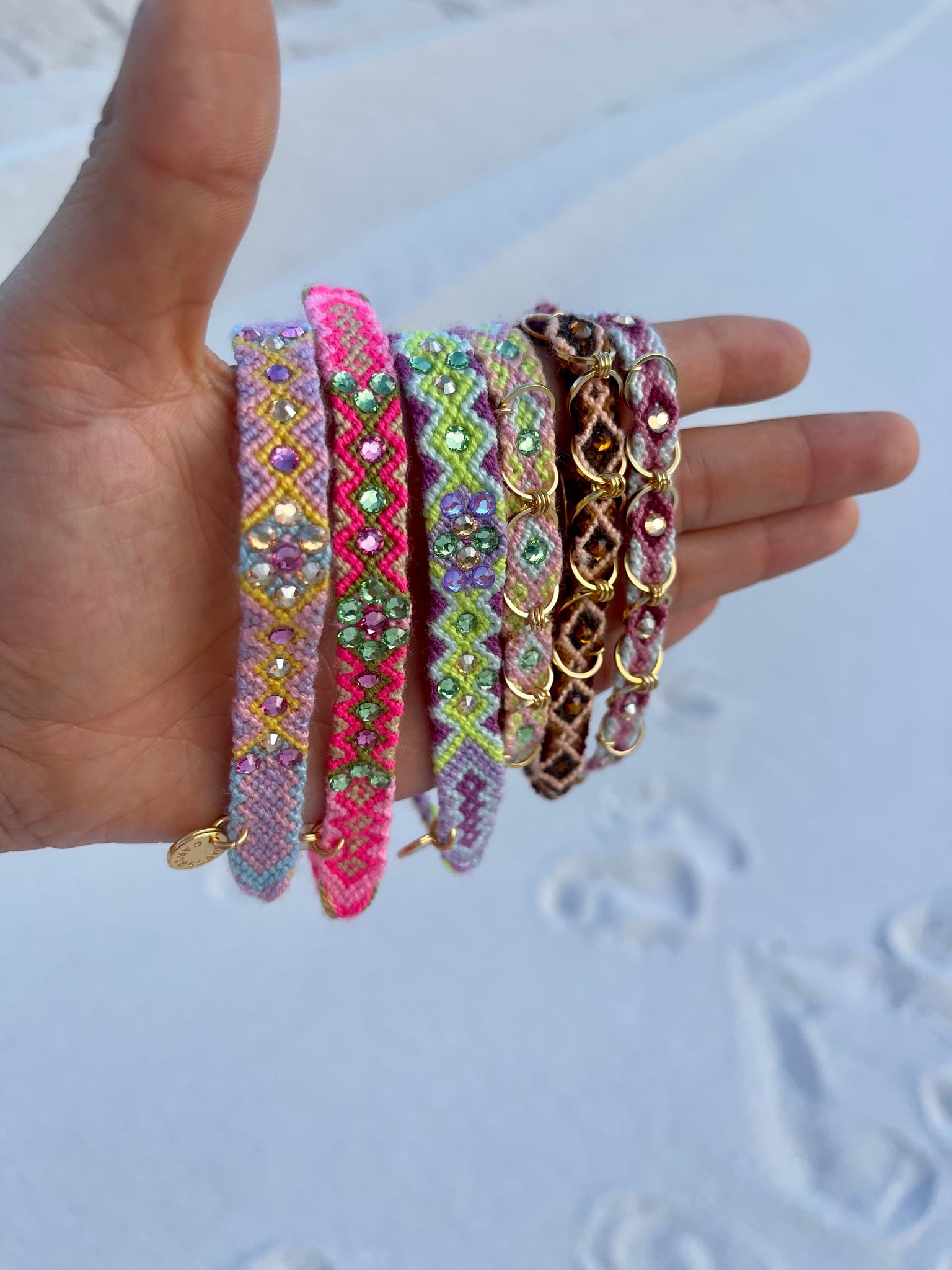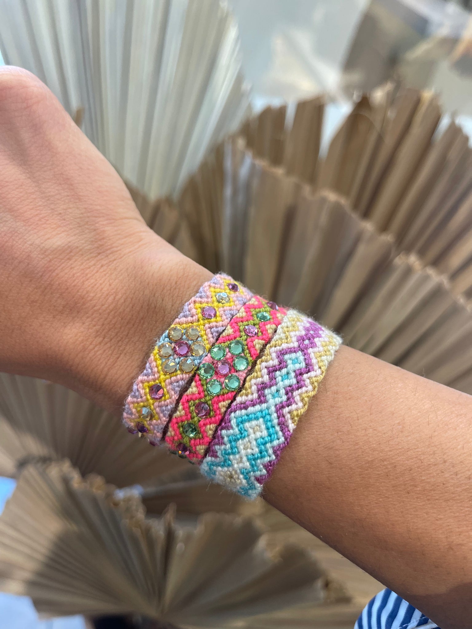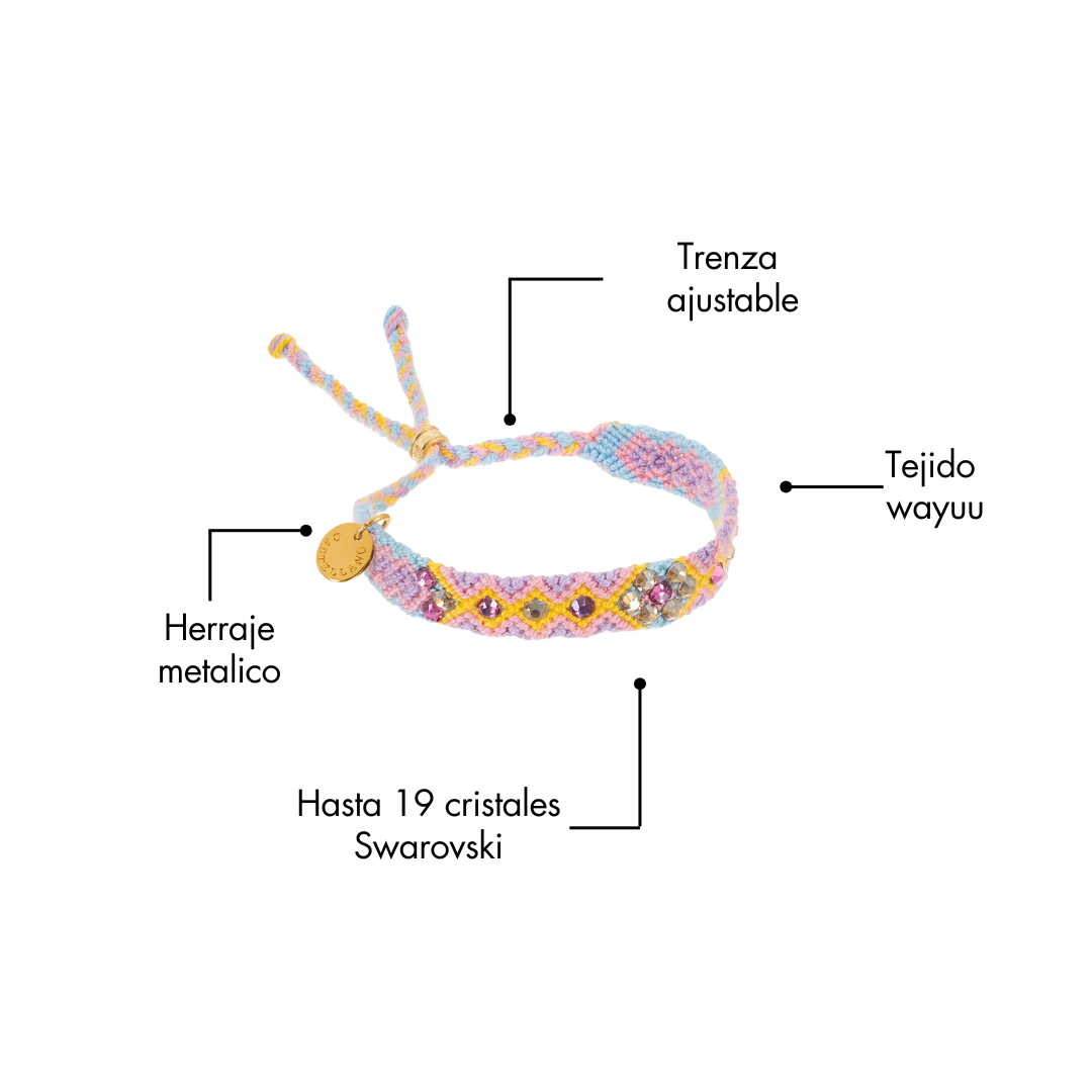 - Pulsera Wayuu tejida a mano con cristales Swarovski y cierre ajustable en tono dorado.