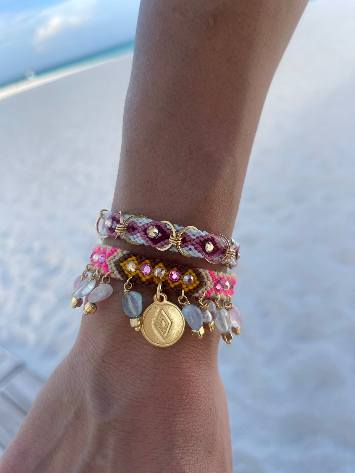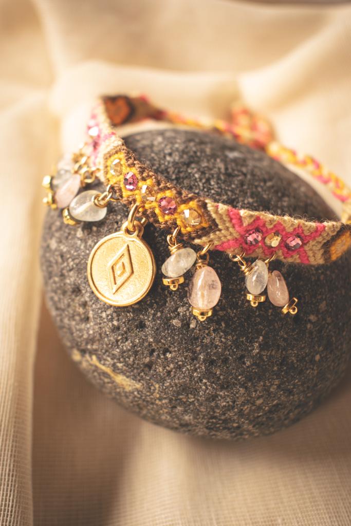 Pulsera Wayuu con cristales Swarovski, cuarzos Citrino, Amatista rosada, Lepidocrocita y pieza en bronce bañado en oro.