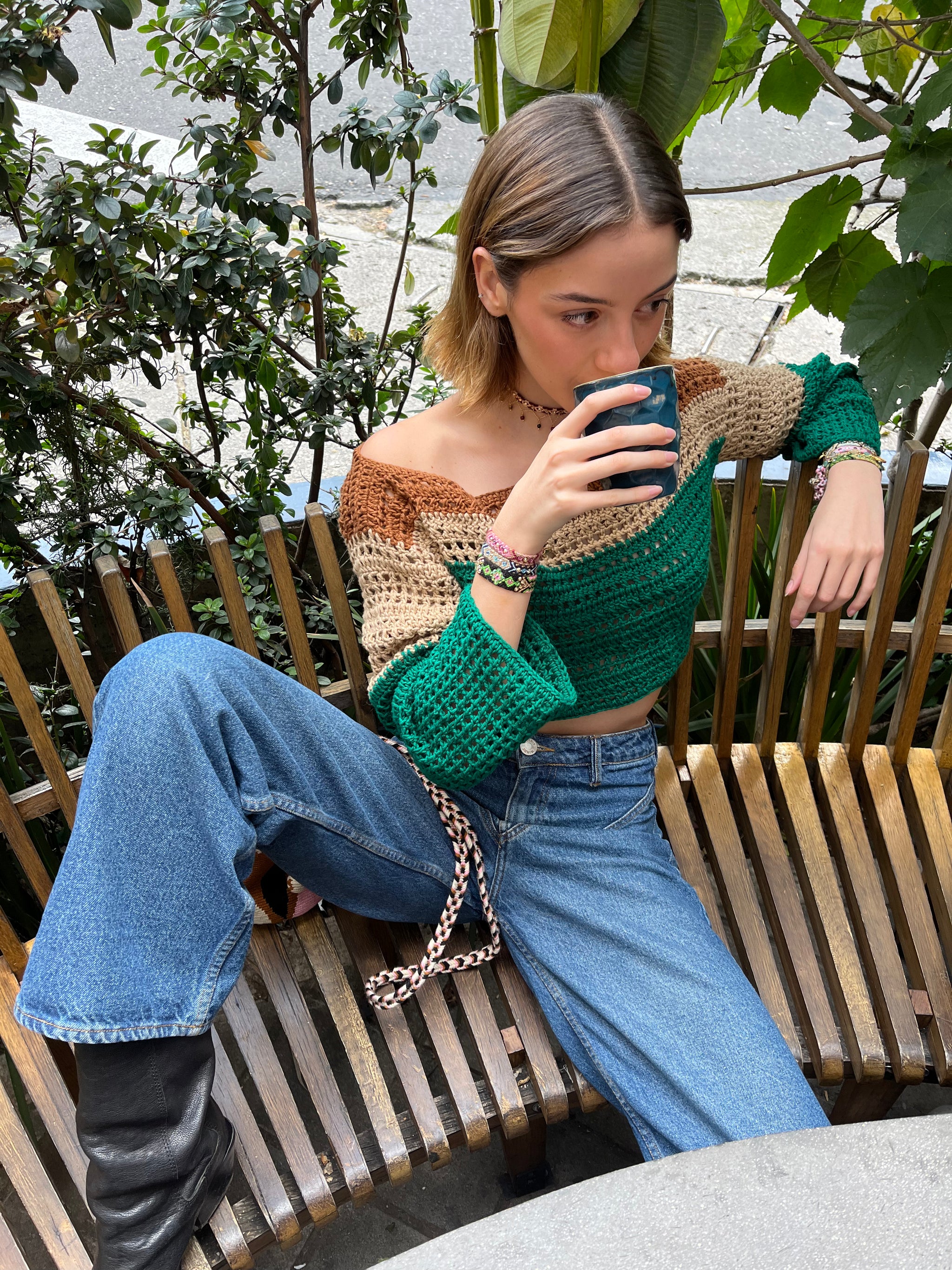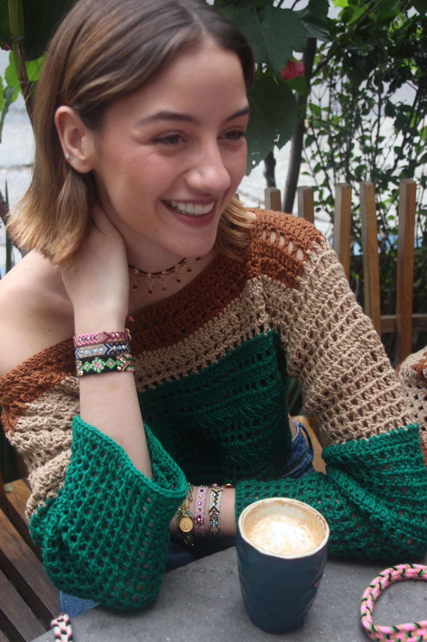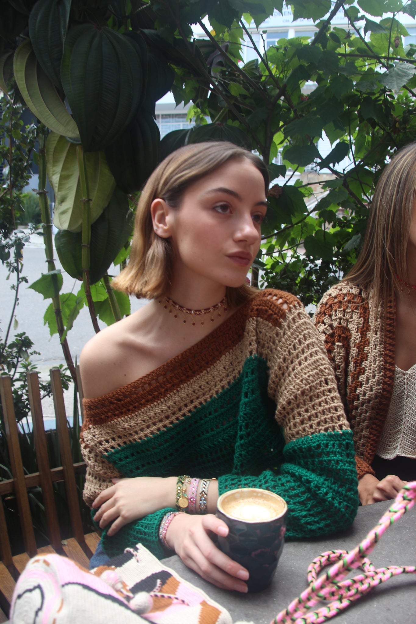 Nuestro cover up tejido por artesanos esta diseñado para que explores su versatilidad, su diseño único combina tres tonos: verde, cafe y beige, creando así una paleta que evoca la tranquilidad y pureza de la naturaleza en sus momentos más serenos.