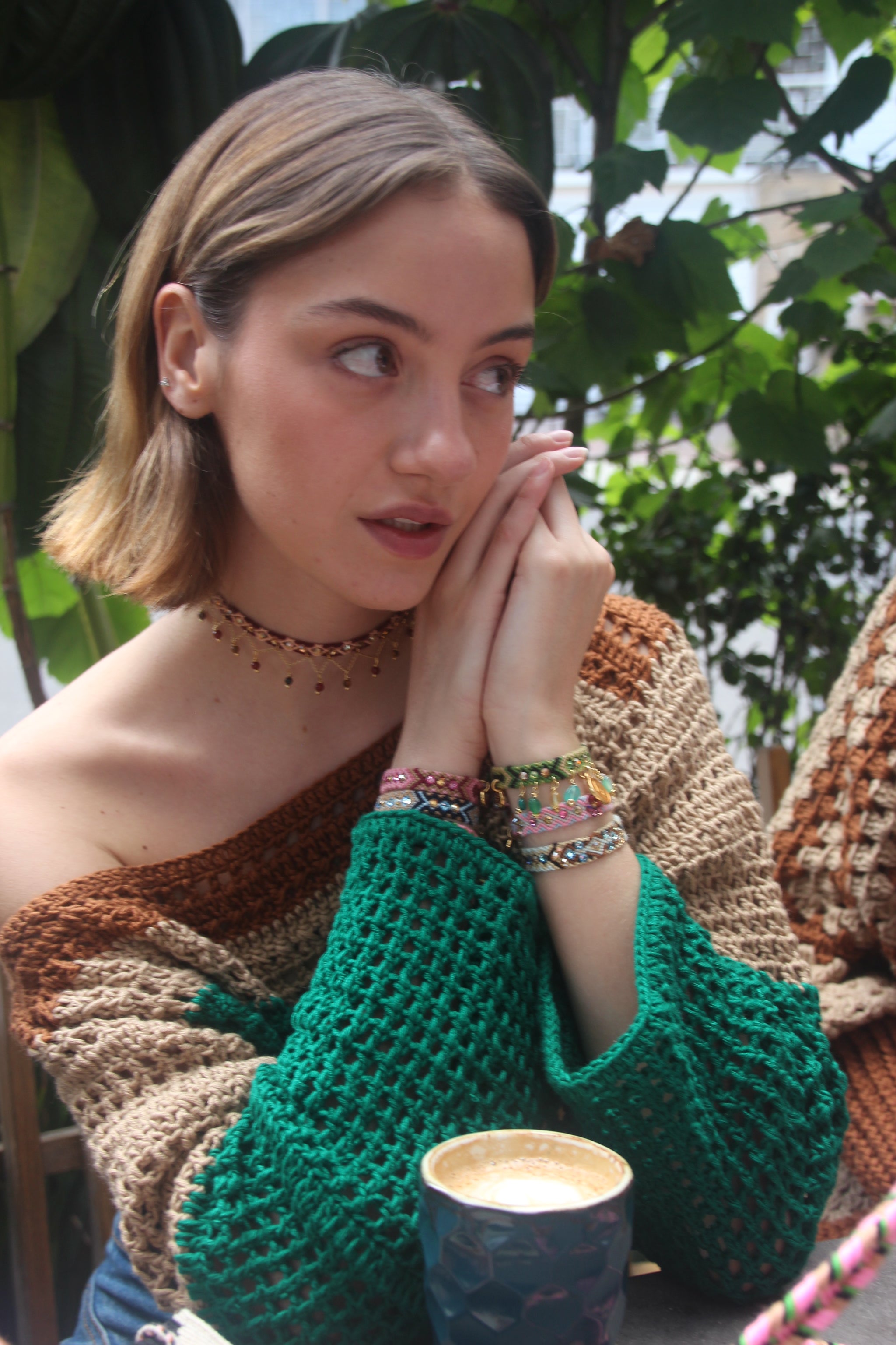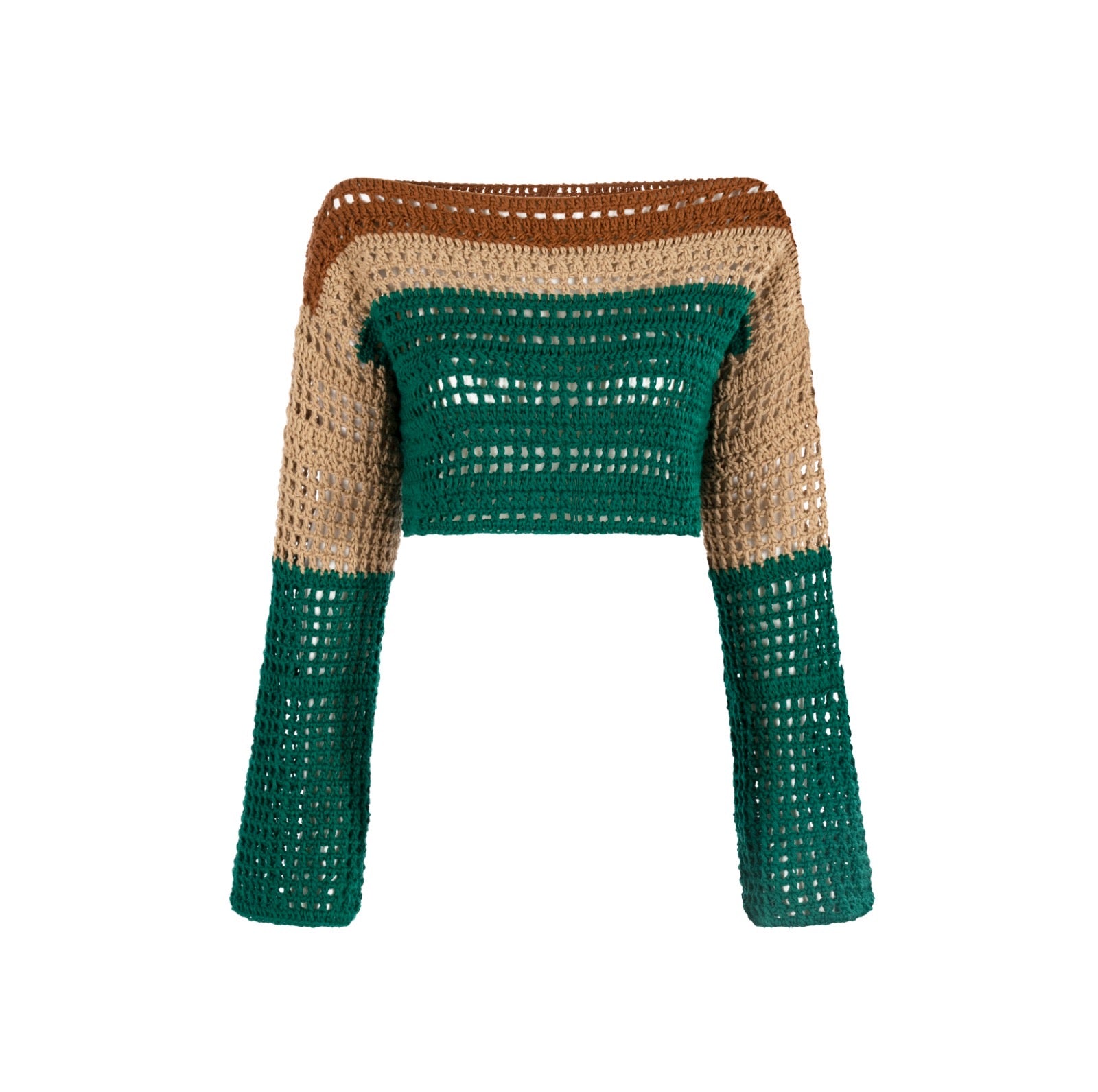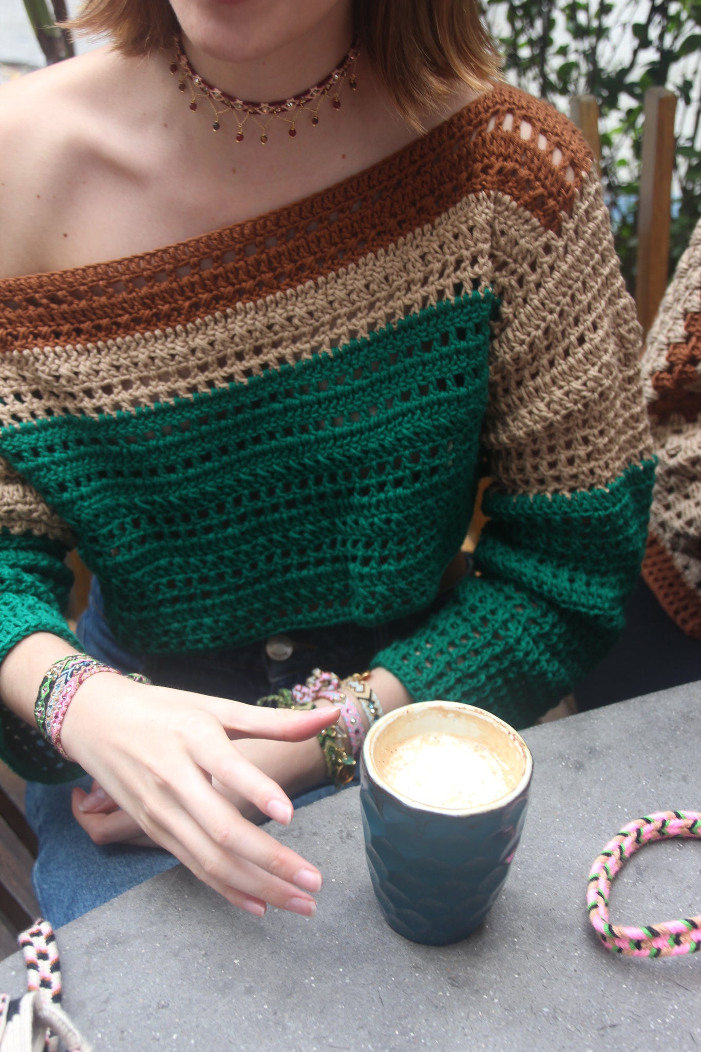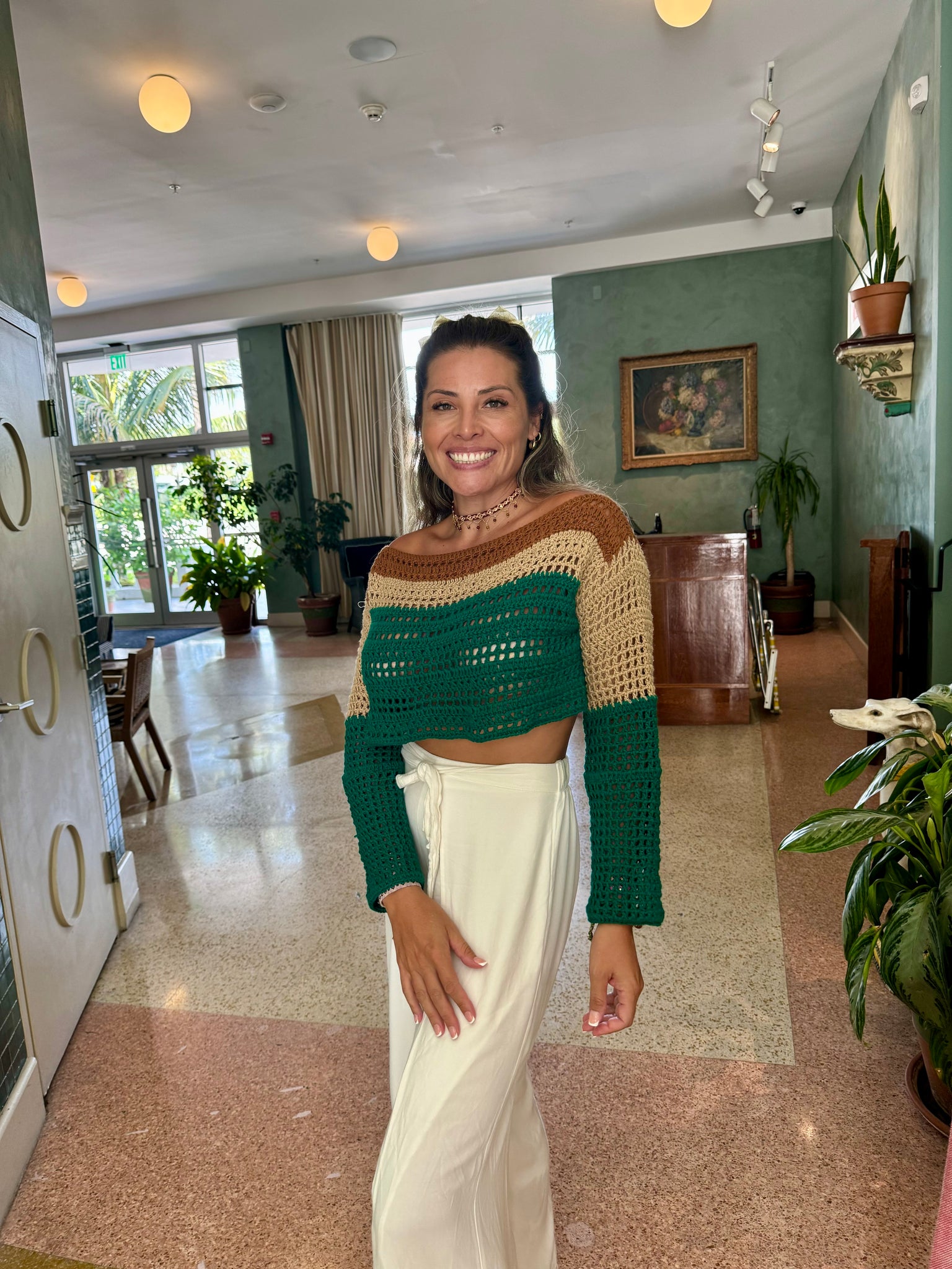 Nuestro cover up tejido por artesanos esta diseñado para que explores su versatilidad, su diseño único combina tres tonos: verde, cafe y beige, creando así una paleta que evoca la tranquilidad y pureza de la naturaleza en sus momentos más serenos.