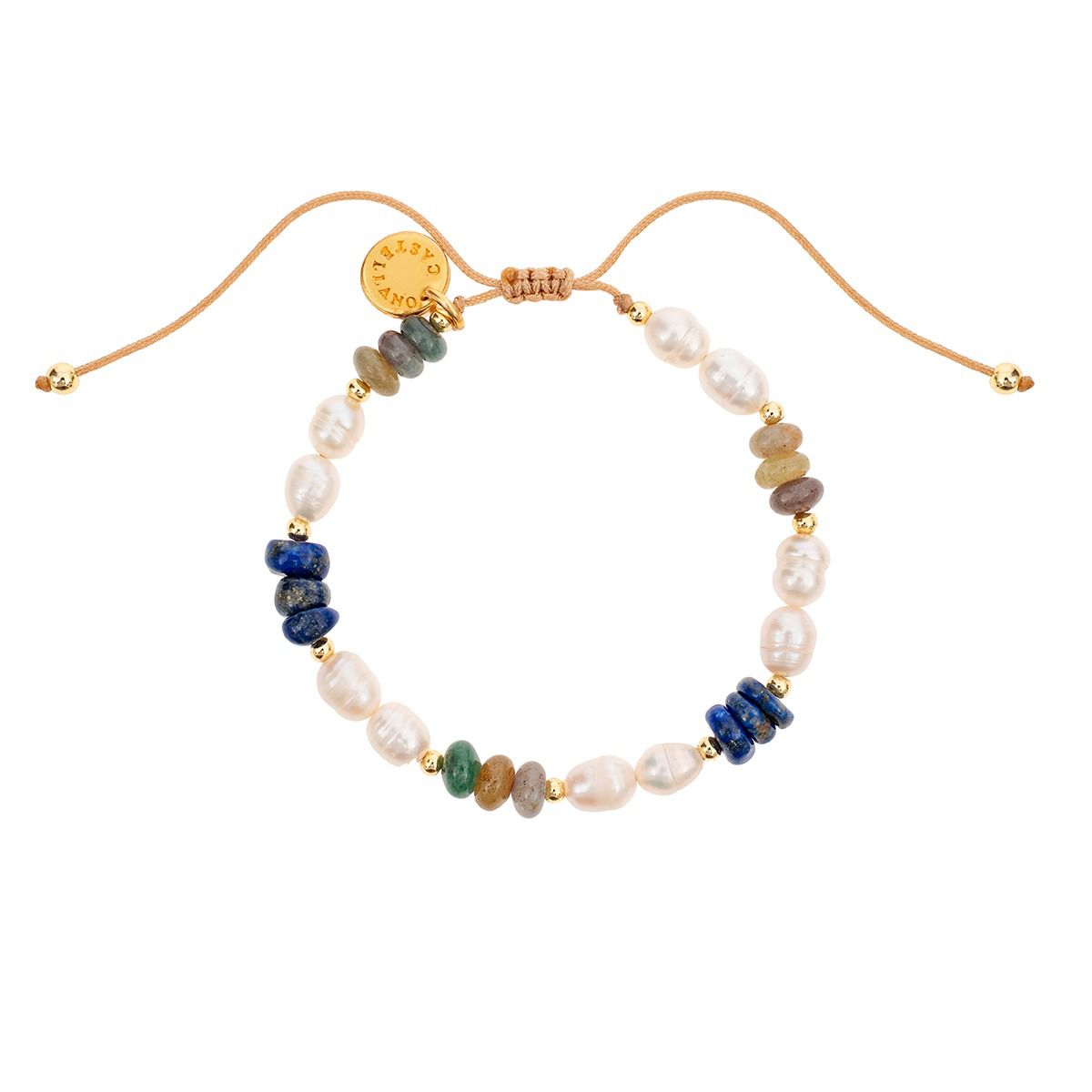 La perla natural  aporta su brillo suave y sedoso, llenando la pulsera de luz y autenticidad.